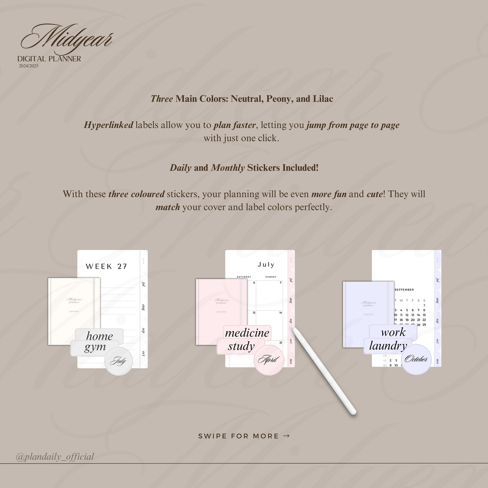 Introducing my first midyear digital planner! This simple, minimalistic planner features monthly and weekly overviews, a yearly calendar, a monthly vision board, and notes. Available in three aesthetic colors—Neutral, Peony, and Lilac—with hyperlinked labels for seamless navigation. Enhance your planning with included daily and monthly stickers. Perfect for organizing your goals, studies, work, and daily tasks. 💌
